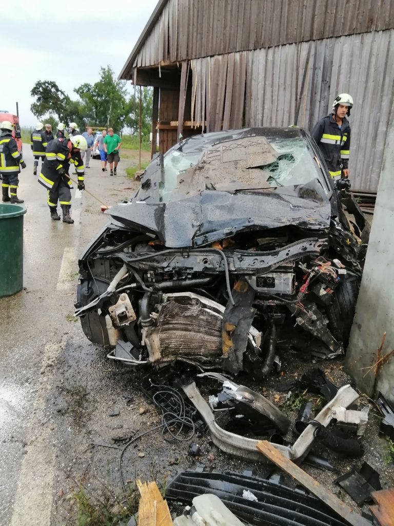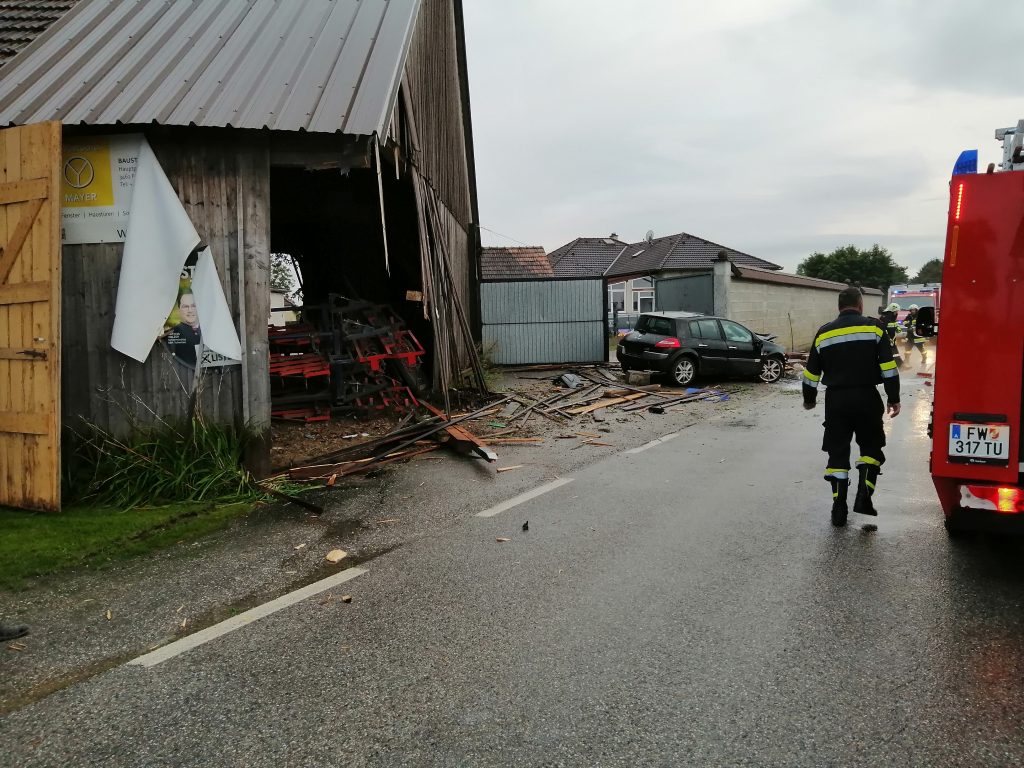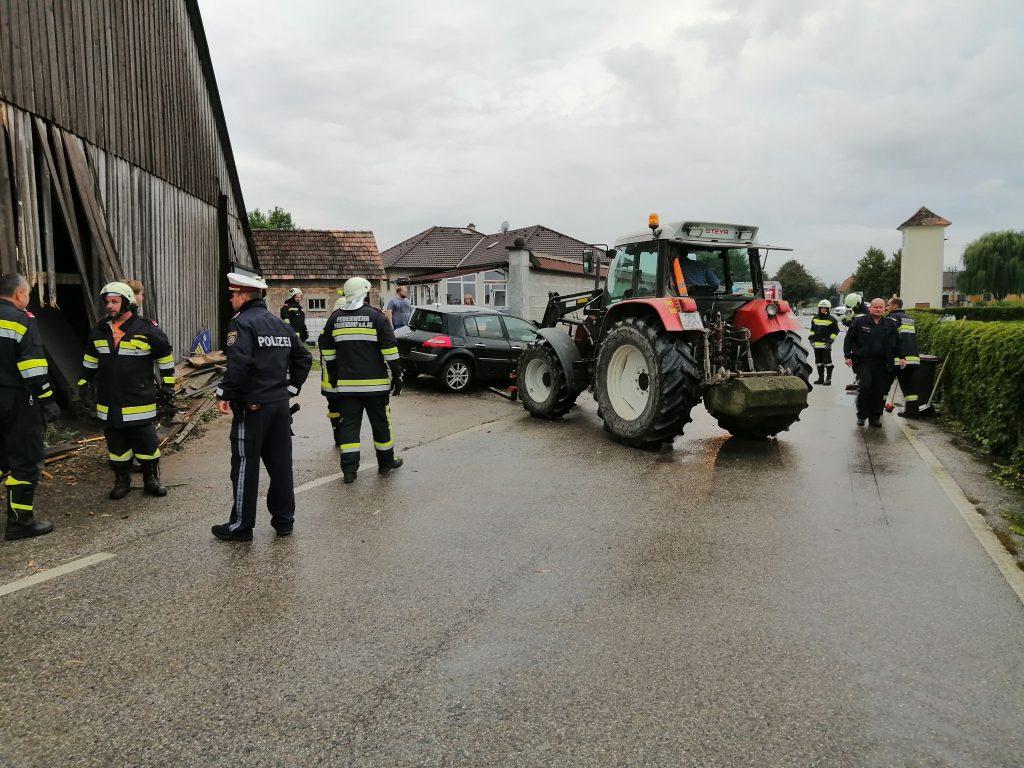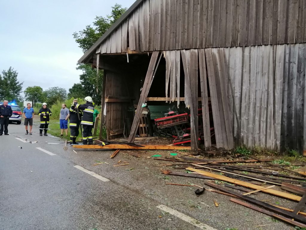 Wir übernahmen das binden der ausgelaufenen Betriebsstoffe, Verbringung des Unfallfahrzeuges an einen sicheren Abstellort, Sicherung des beschädigten Stadels da Einsturzgefahr bestand, verschieben der teilweise beschädigten Landwirtschaftlichen Geräte im Stadel und die Absperrung der Straße sowie Verkehrsregelung währen des Einsatzes.